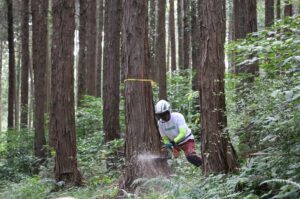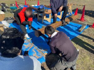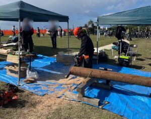 組合では丸太の輪切り体験やチェンソーの実演、大型のチェンソーをエンジンかけてみたりしました。